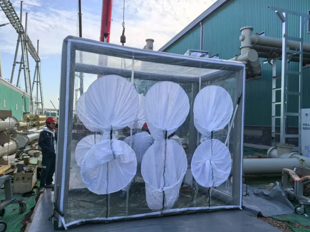 設(shè)備安裝是換流站建設(shè)的核心環(huán)節(jié),現(xiàn)場采用八級防塵法,“觀塵、抑塵、降塵、除塵、控塵、擋塵、絕塵、計塵”,控制設(shè)備安裝環(huán)境,構(gòu)建“分級防塵棚+循環(huán)吸擦技術(shù)”管理模式,以百萬級潔凈度保障設(shè)備“零塵?!苯桓?。